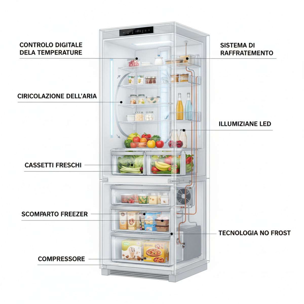 Il frigorifero è uno degli elettrodomestici più importanti nella vita quotidiana. La sua funzione principale è quella di conservare gli alimenti a basse temperature, rallentando la crescita dei batteri e mantenendo il cibo fresco più a lungo.
